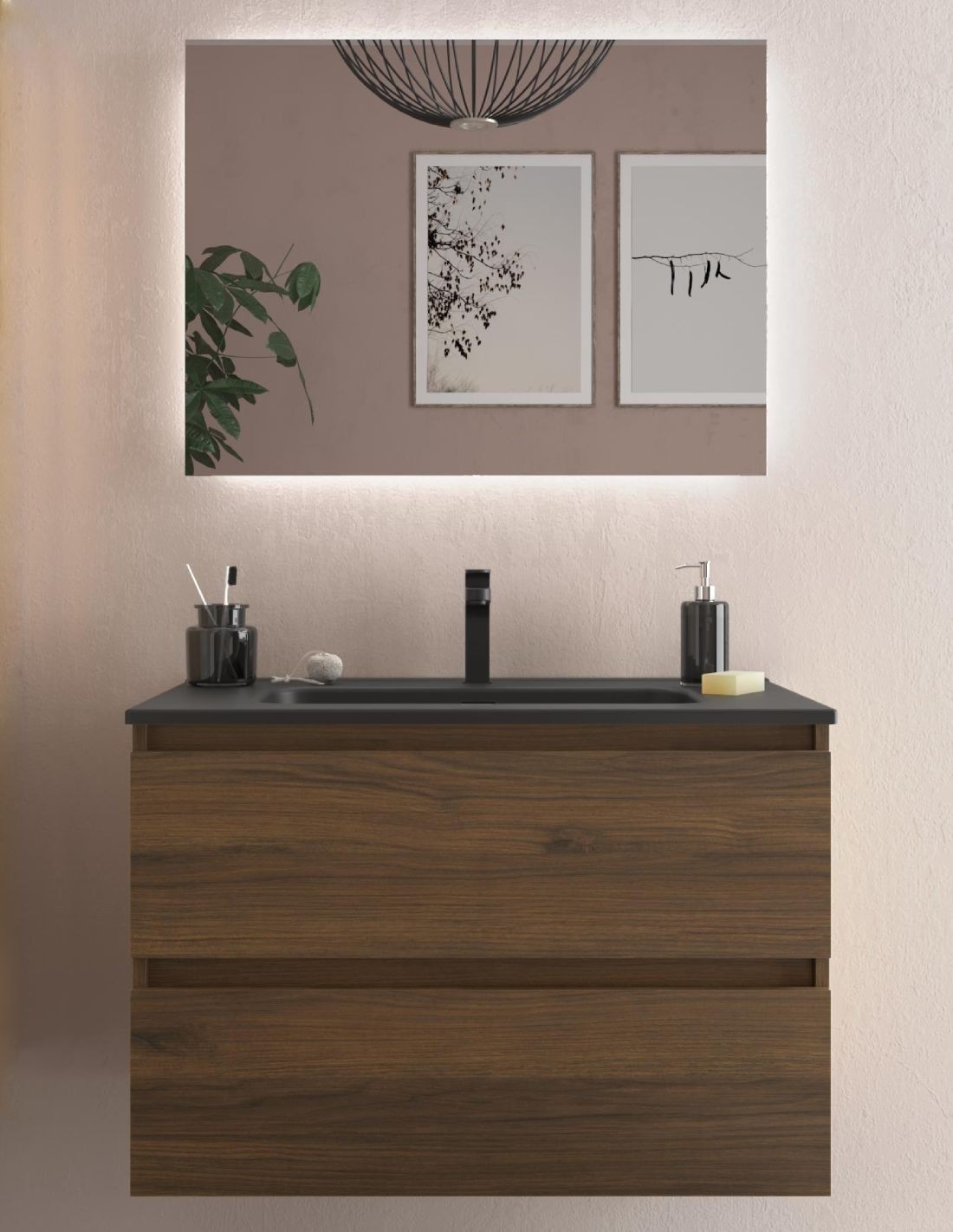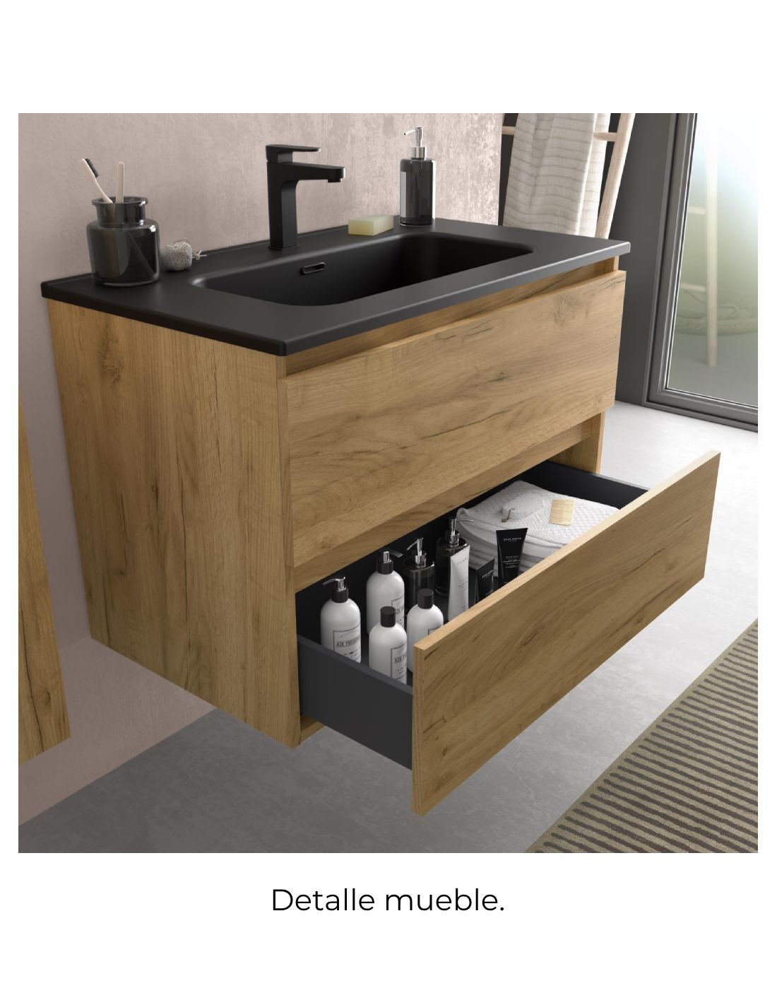 ¿Buscas un mueble de baño de con diseño moderno y elegante? El modelo de mueble baño lavabo negro Bequia es lo que buscas. Si quieres darle a tu cuarto de baño un estilo innovador y de diseño, sin duda este es el mueble que buscas. Además, con lavabo negro para unirte a la tendencia de los detalles en negros en los baños.
