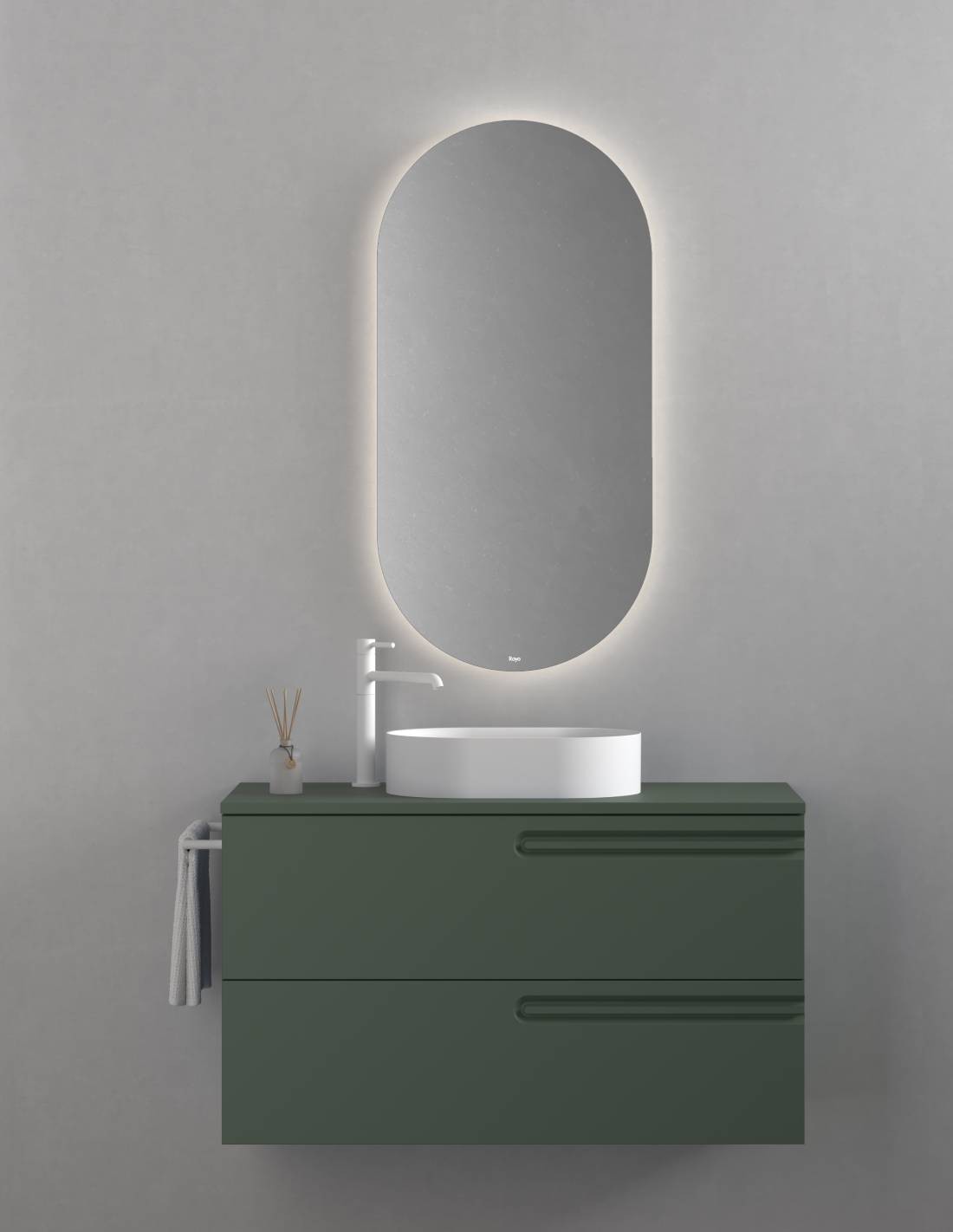 Incluido: Lavabo de solid surface sobre encimera de diseño exclusivo modelo OVAL en acabado Blanco Mate. Incluye embellecedor serigradiado en el mismo tono.