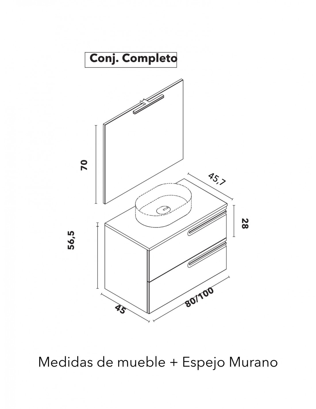 • Conjunto Completo: Aplique LED Luminaria Lucce 30 + Espejo sin luz rectangular Murano (Perfil con acabado gris. Altura: 70 cm. Profundidad: 2,6 cm. Dispone de hueco para el transformador) + lavabo cerámico Enzo Blanco Brillo + mueble Econic.