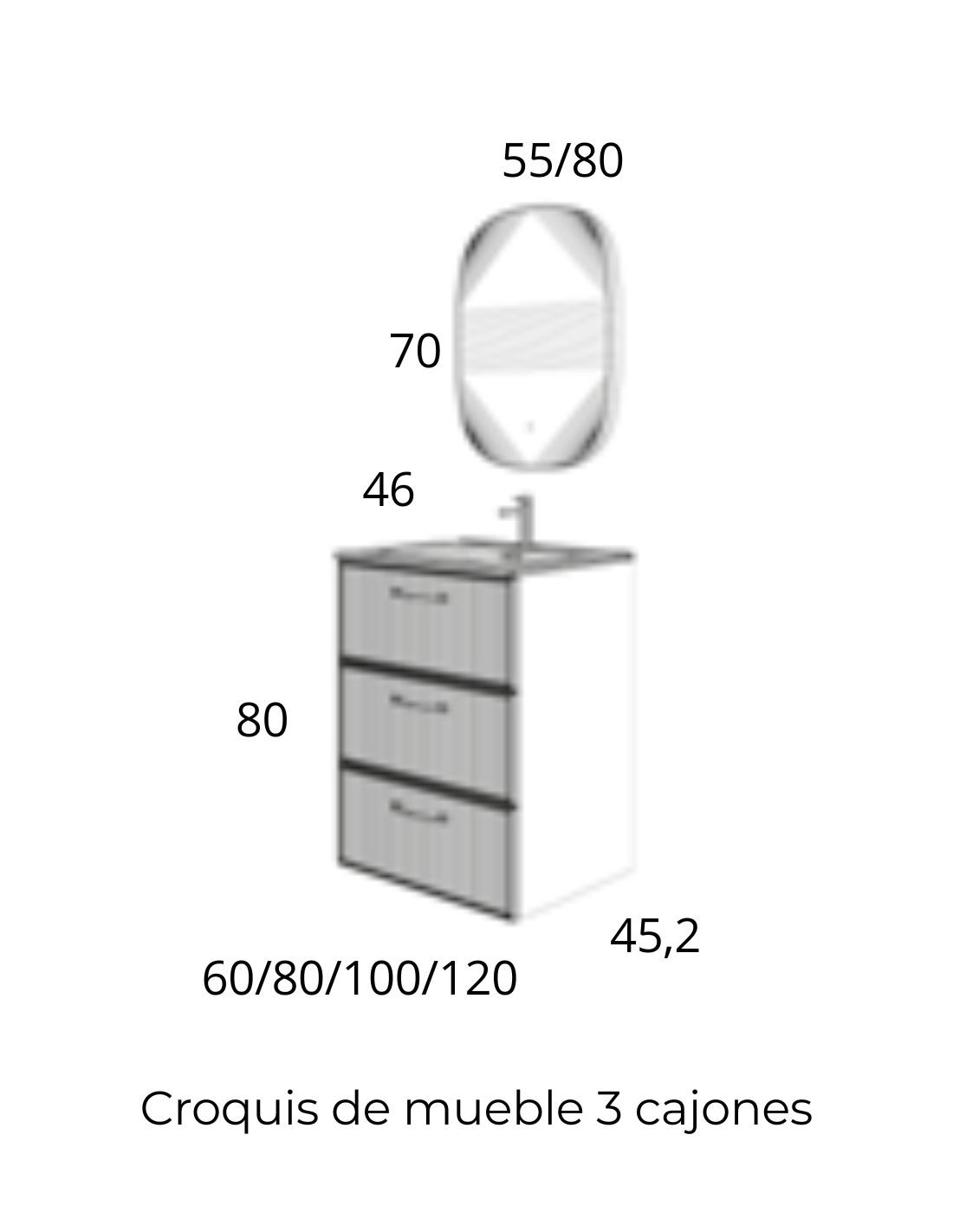 ANCHO: 60, 70, 80 y 100 cm. (3 cajones y un lavabo). Disponible también en 120 cm y 140 cm (6 cajones y lavabo doble seno) consultar.