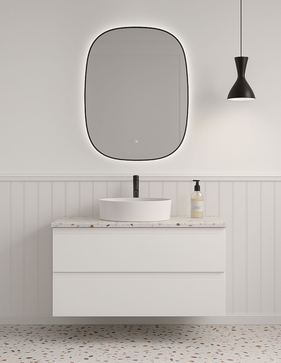 Encimera de piedra compacta Mix con grosor de 2 cm, resistente, duradera y fácil de mantener, que aporta un acabado sofisticado y robusto a tu baño.