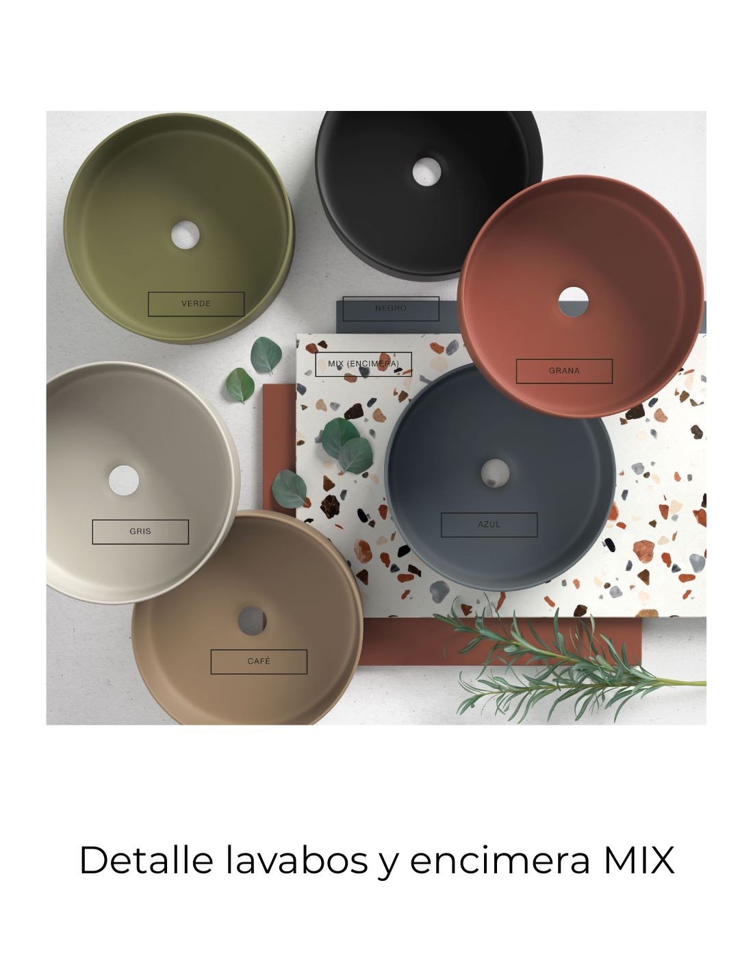 Encimera de piedra compacta Mix con grosor de 2 cm, resistente, duradera y fácil de mantener, que aporta un acabado sofisticado y robusto a tu baño.