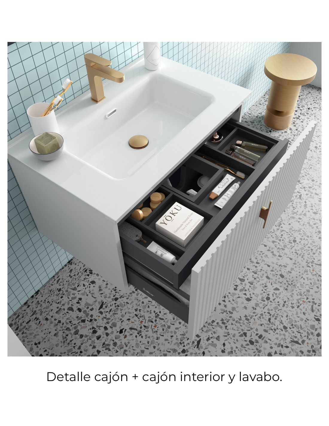 Este mueble de baño con sus frentes con tecnología 3D, con ranuras verticales, aportan un toque de diseño y personalidad a tu baño. El modelo de conjunto Biba Salgar 1 cajón + 1 cajón interior es lo que buscas. Además, Disponible en 11 acabados. Desde maderas para darle a tu baño un toque atemporal hasta colores modernos como azules o verdes que tan tendencia están estos años. ¡Conócelo!
