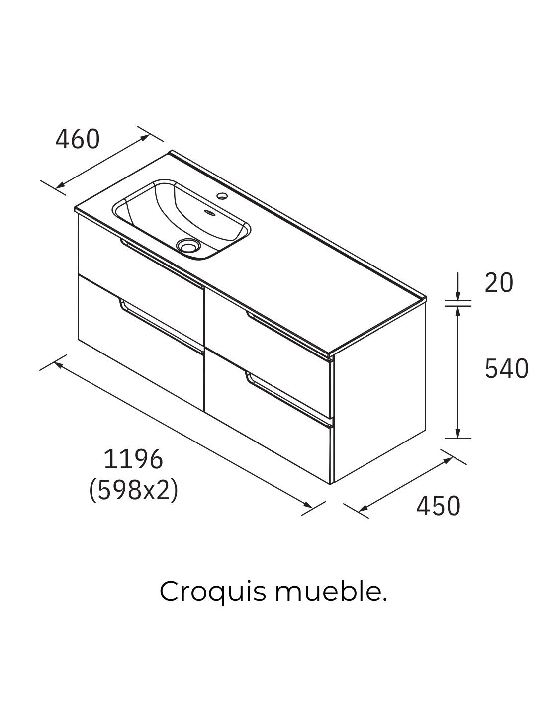 ANCHO: 120 cm. (4 cajones y un lavabo un seno desplazado izq / dcha). También disponible con lavabo de doble seno.