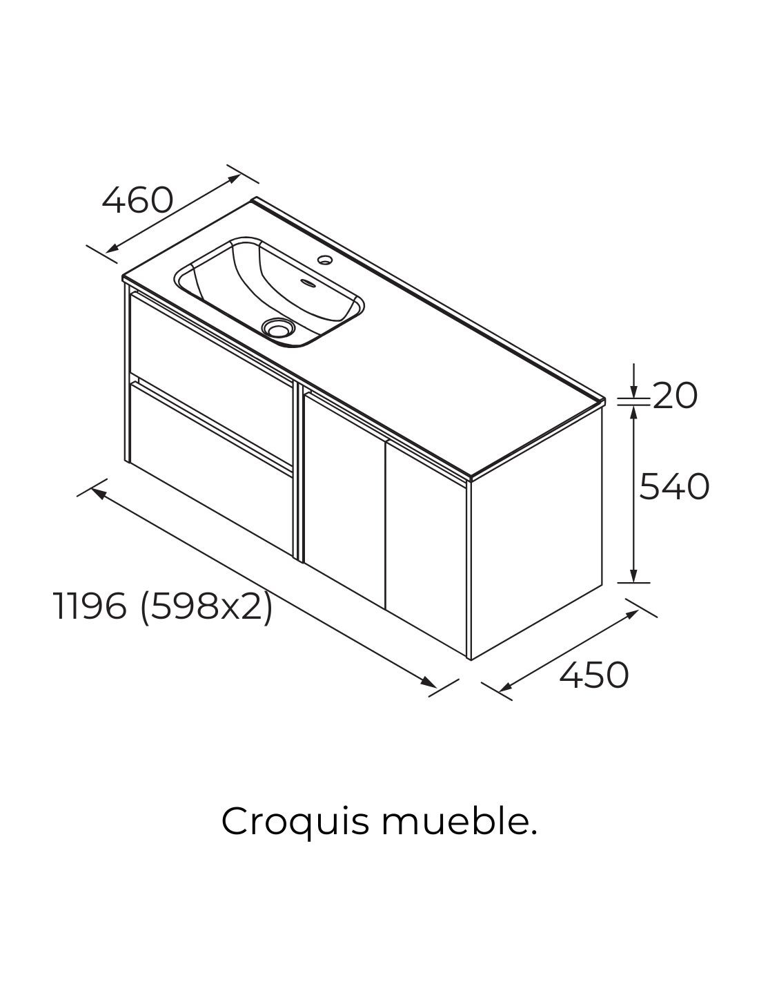ANCHO:  120 cm. (2 puertas + 2 cajones y 1 lavabo de seno desplazado). También disponible con lavabo de doble seno.