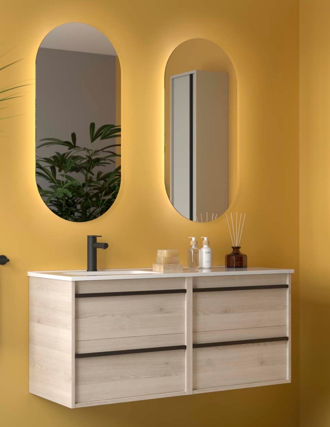 Mueble baño 120 cm lavabo desplazado acabados