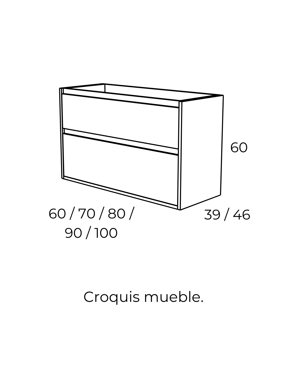 ANCHO: 60, 70, 80, 90 y 100 cm. (2 cajones y un lavabo). Disponible también en 120 y 140 cm.