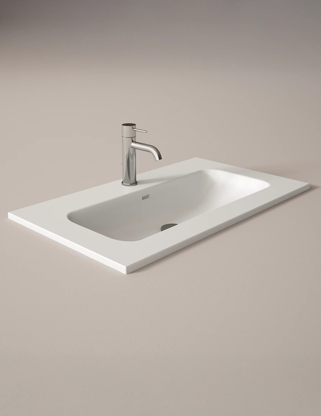 Lavabo cerámico blanco brillo modelo IDEA de diseño exclusivo. Lavabo de un seno centrado. También disponible con 2 senos en 120 cms. ¡Descubre más detalles en la ficha técnica del lavabo!