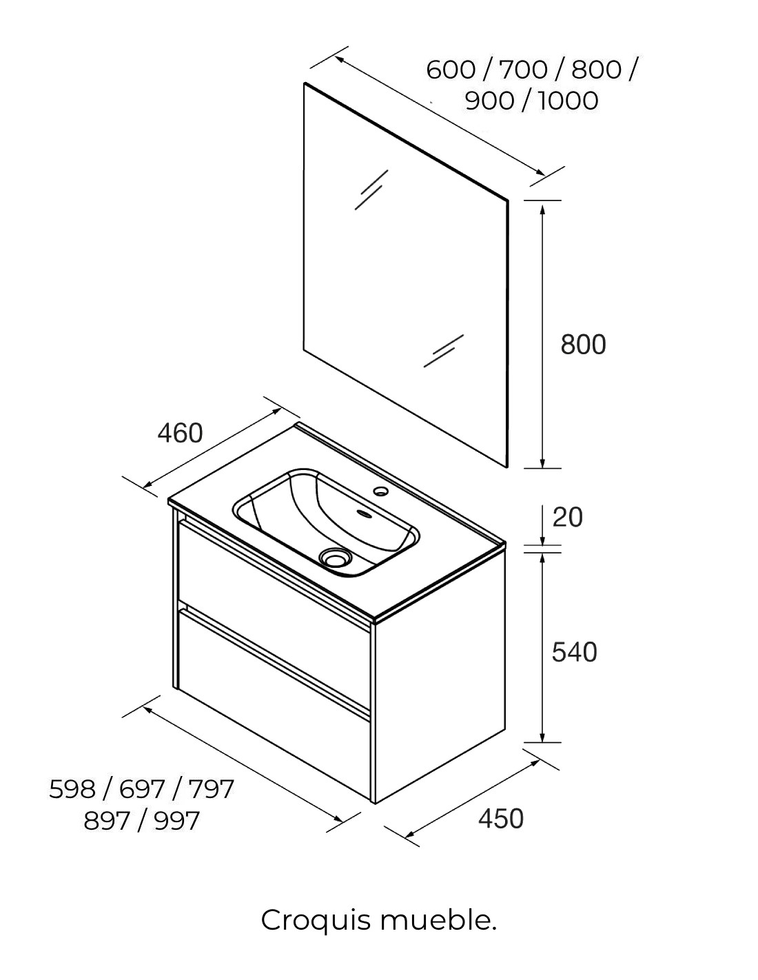 ANCHO: 60, 70, 80, 90 y 100 cm. (2 cajones y un lavabo). Disponible también en 120 y 140 cm.