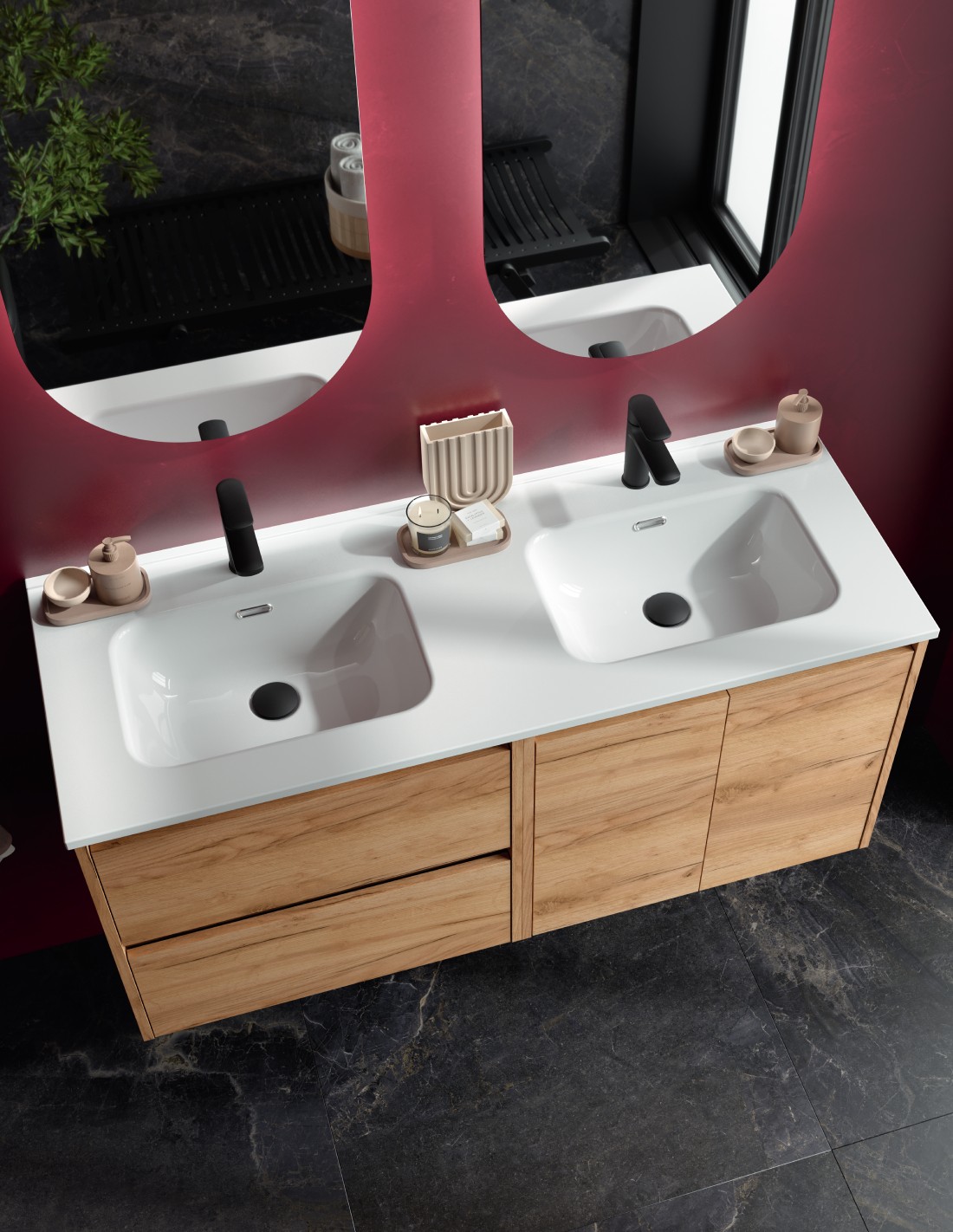 Dos maneras de entender el baño. Según tu estilo, la serie NOJA te ofrece la libertad de elegir. El modelo de 90 cm. desplazado puede vestirse con una encimera y lavabo de posar para un diseño ligero y contemporáneo, o con el lavabo integral Ibón desplazado, que aporta continuidad, limpieza visual y máxima funcionalidad. Dos opciones distintas, un mismo resultado: un baño hecho a tu medida.