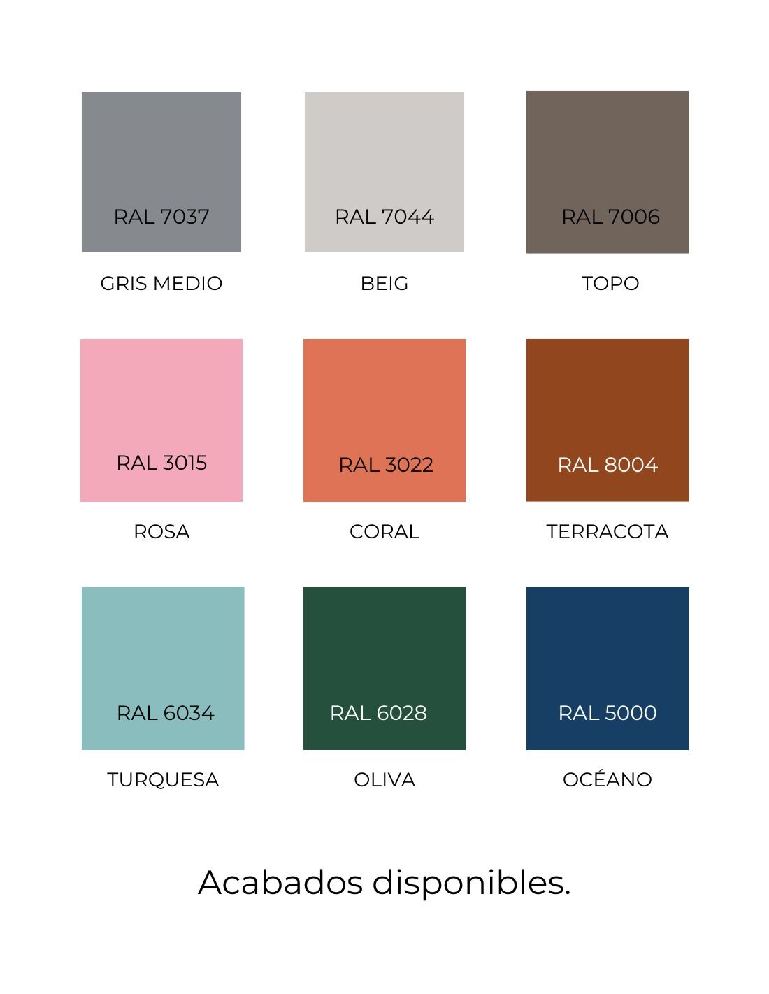 Disponible en 9 acabados: BEIG, GRIS MEDIO, TOPO, ROSA, CORAL, TERRACOTA, TURQUESA, OCÉANO y OLIVA.