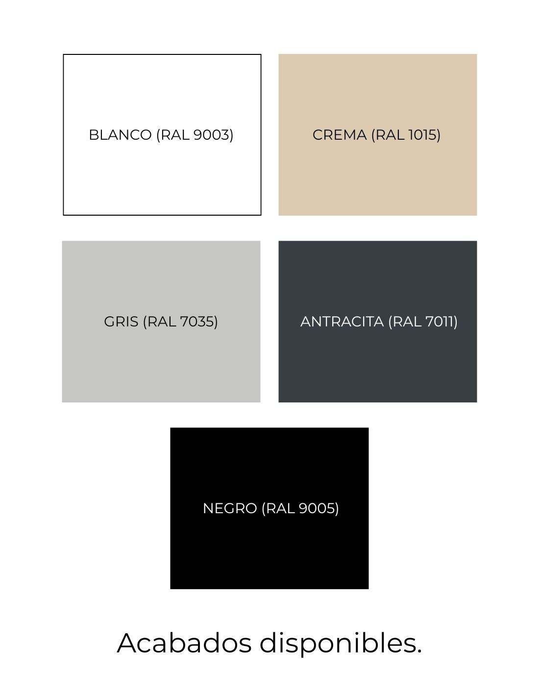 Disponible en acabados: BLANCO, GRIS 7035, ANTRACITA, NEGRO y CREMA.
