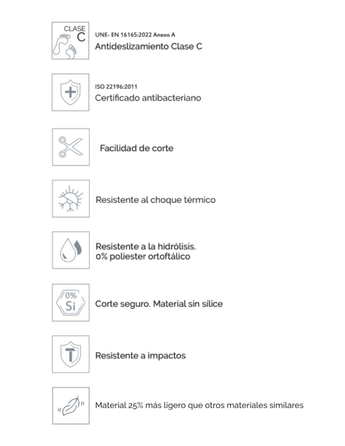 • Certificado antibacteriano (ISO 22196:2011).