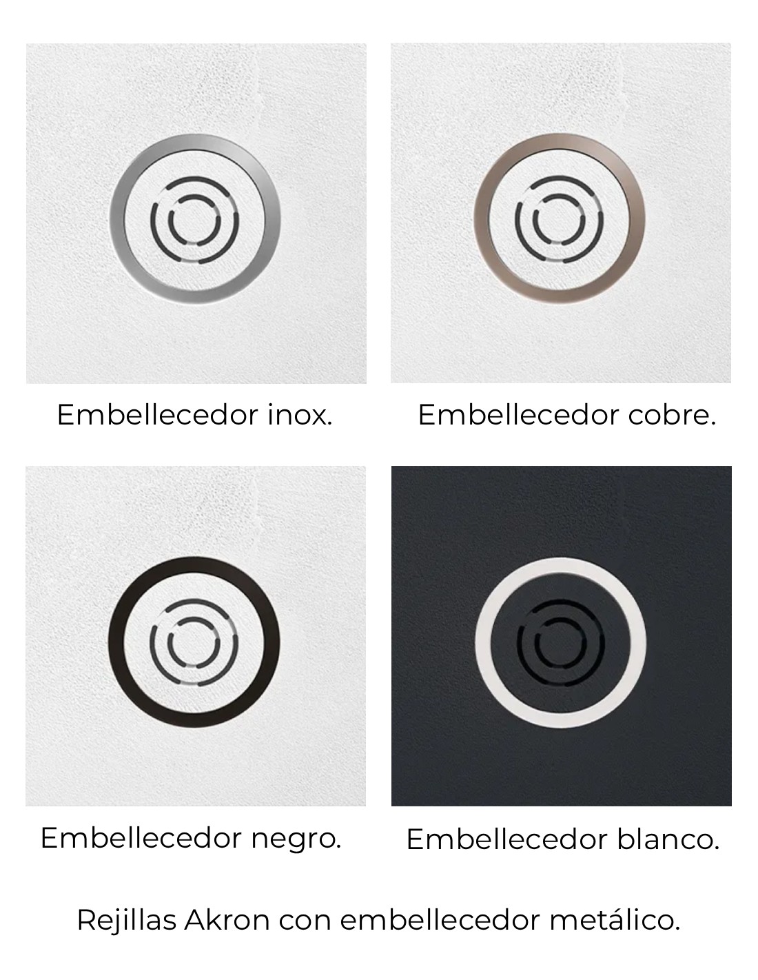- Rejilla Akron del mismo material y color del plato de ducha con embellecedor metálico a elegir: inox., cobre, blanco o negro.