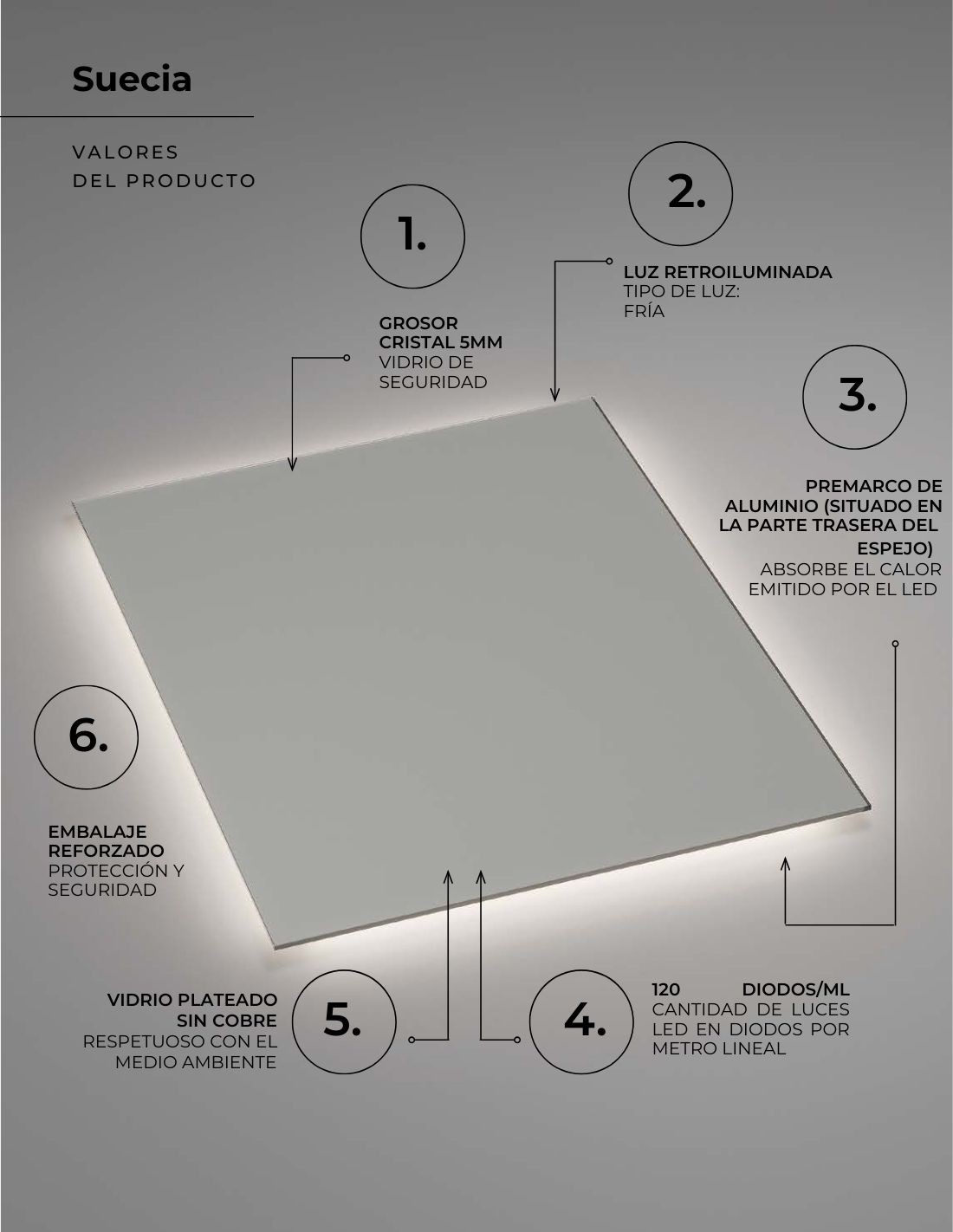 Conoce las características principales del espejo rectangular LED modelo SUECIA de Imex: