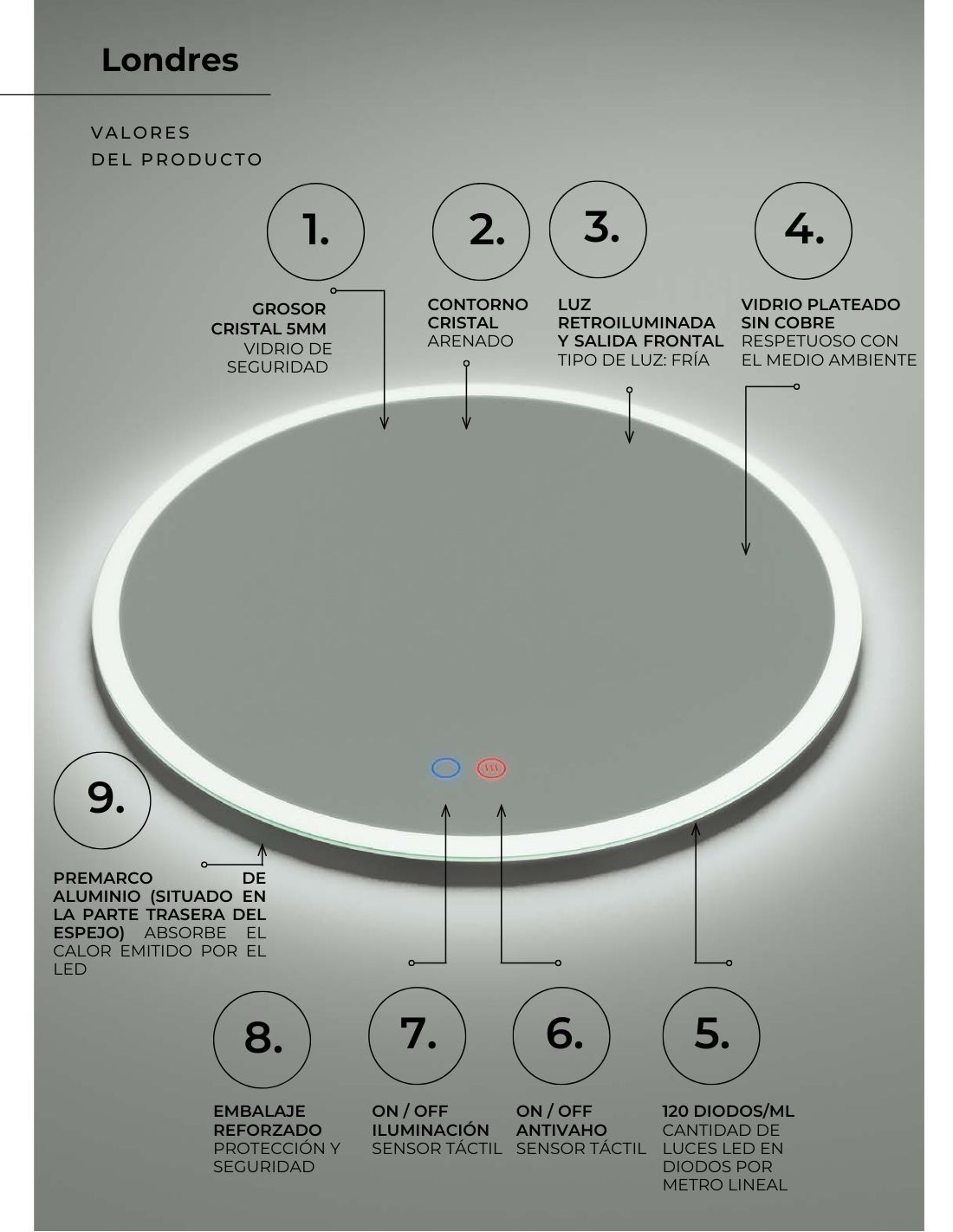 Conoce las características principales del espejo circular sin marco modelo LONDRES de LED Imex: