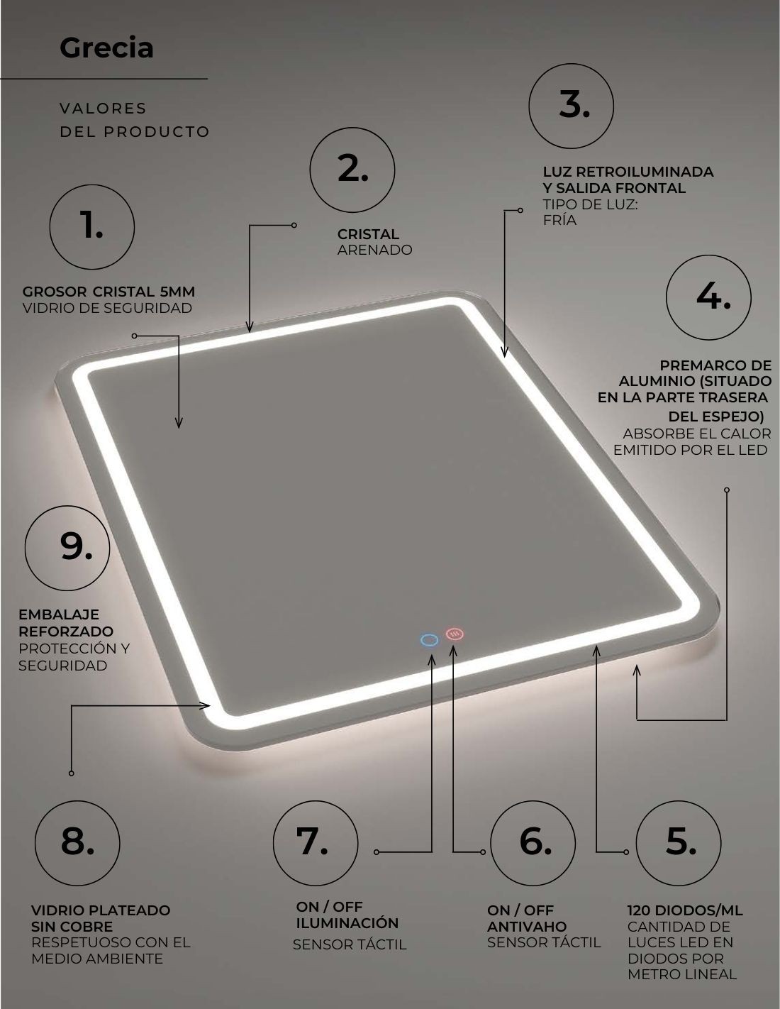 Espejo rectangular retroiluminado modelo GRECIA de Imex. ¡Dale a tu baño un toque elegante y sofisticado con nuestro modelo GRECIA! Si buscas darle a tu cuarto de baño un estilo elegante y clásico, este es tu espejo.