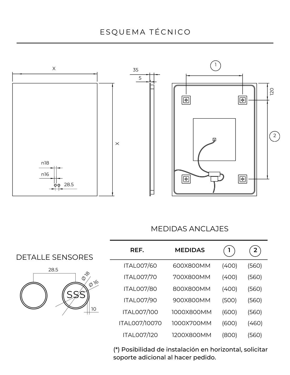 Disponible en las medidas: 60, 70, 80, 90, 100 o 120 cm. de ancho x 80 cm. de alto. y 100 cm. ancho x 70 cm. alto.