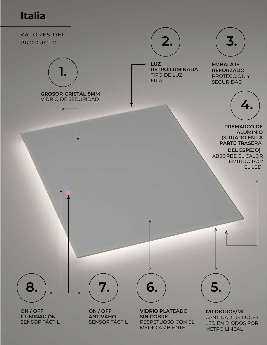 Conoce las características principales del espejo para baño con luz modelo ITALIA de LED Imex: