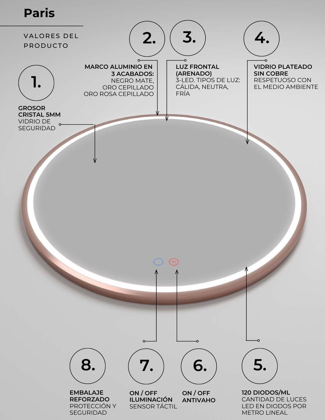 Conoce las características principales del espejo redondo oro rosa modelo PARÍS de LED Imex:
