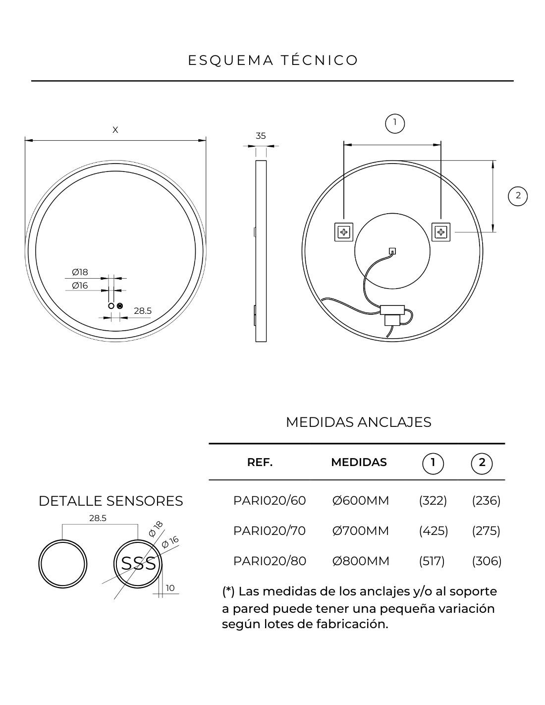 - Medidas disponibles del espejo: