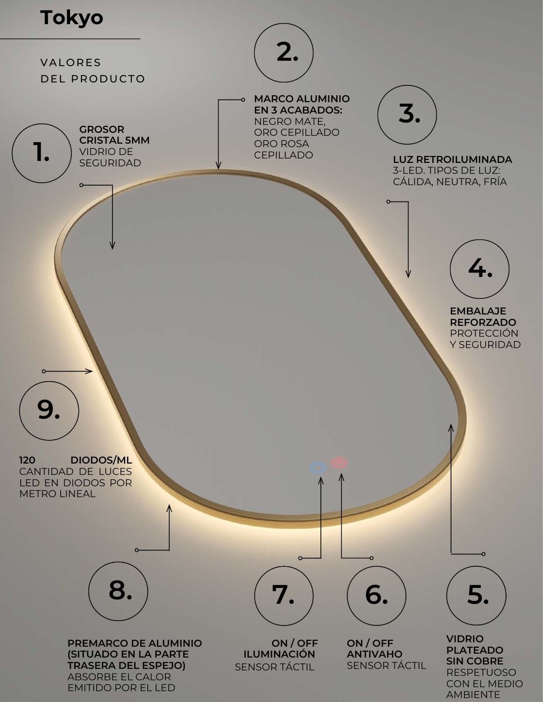 Conoce las características principales del espejo negro ovalado modelo TOKYO LED de Imex: