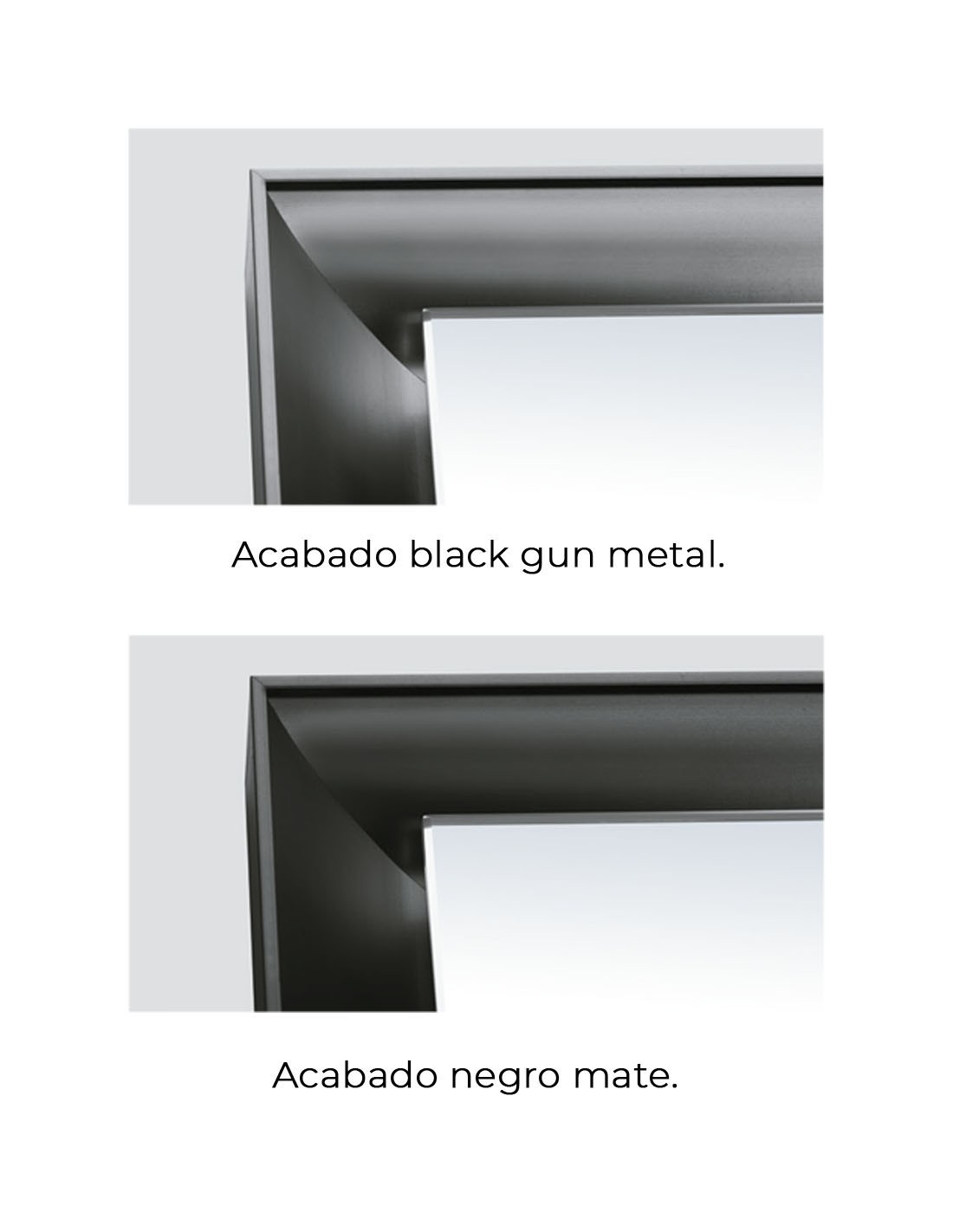 - Marco de acero inoxidable en negro mate o black gun metal. También disponible en oro cepillado.