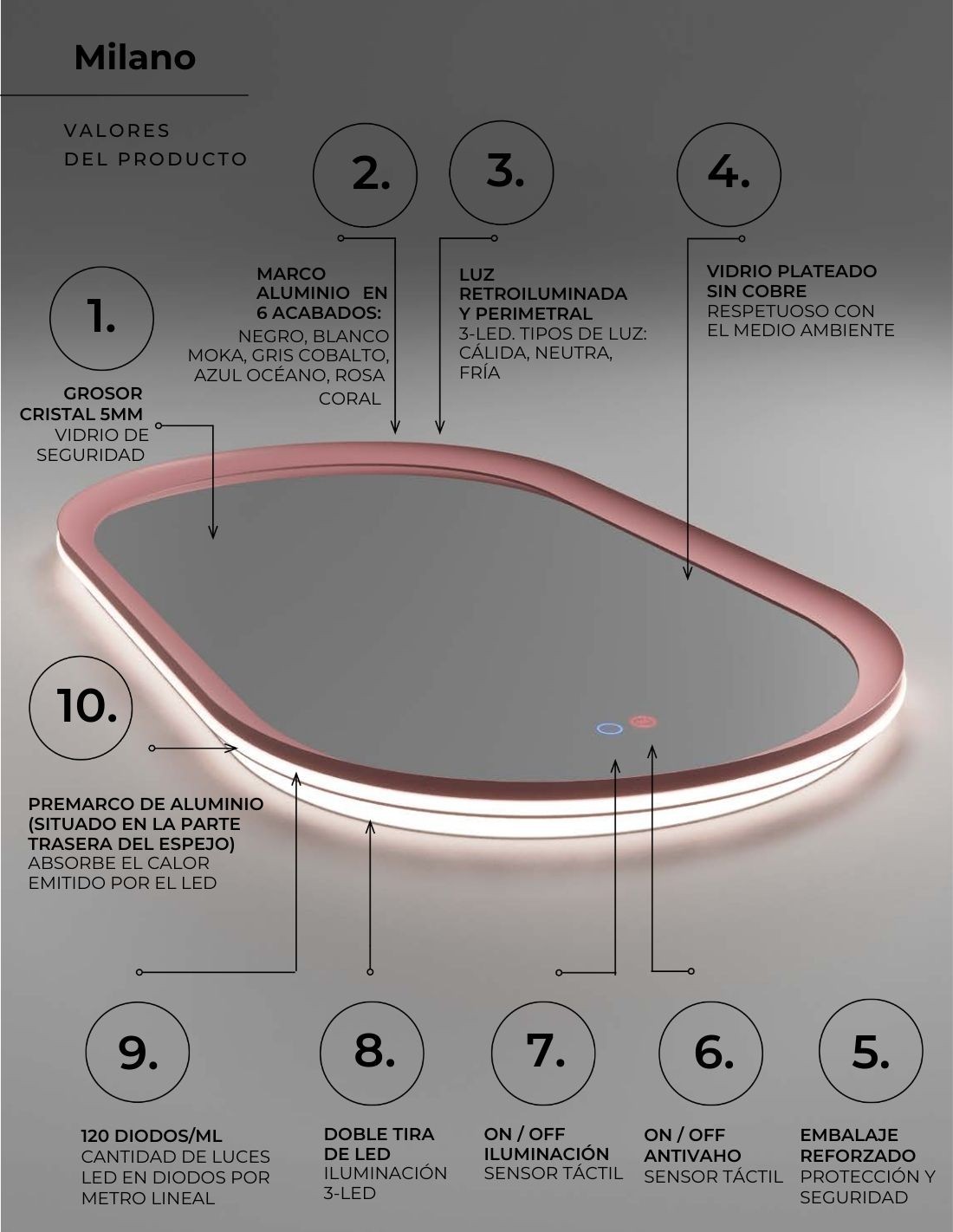 • Luz retroiluminada y en el perímetro de la parte posterior del marco.