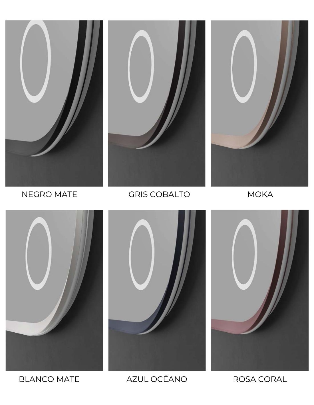 Marco de aluminio disponible en acabados: negro mate, blanco mate, moka, rosa coral, gris cobalto y azul océano.