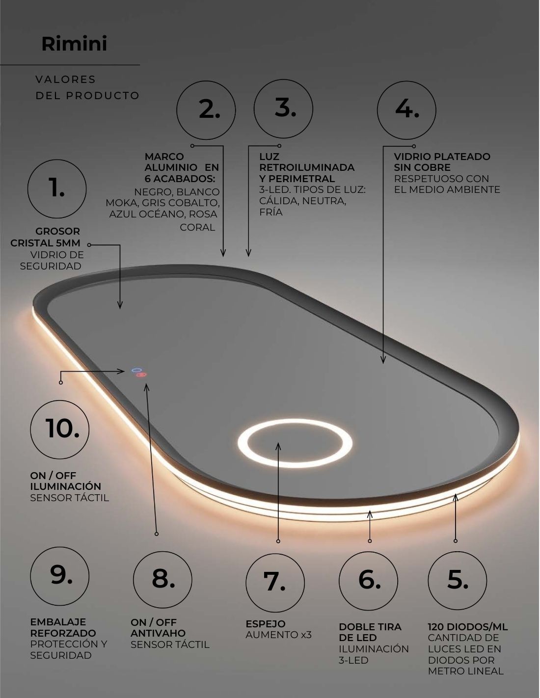 Conoce las características principales del espejo ovalado led RIMINI: