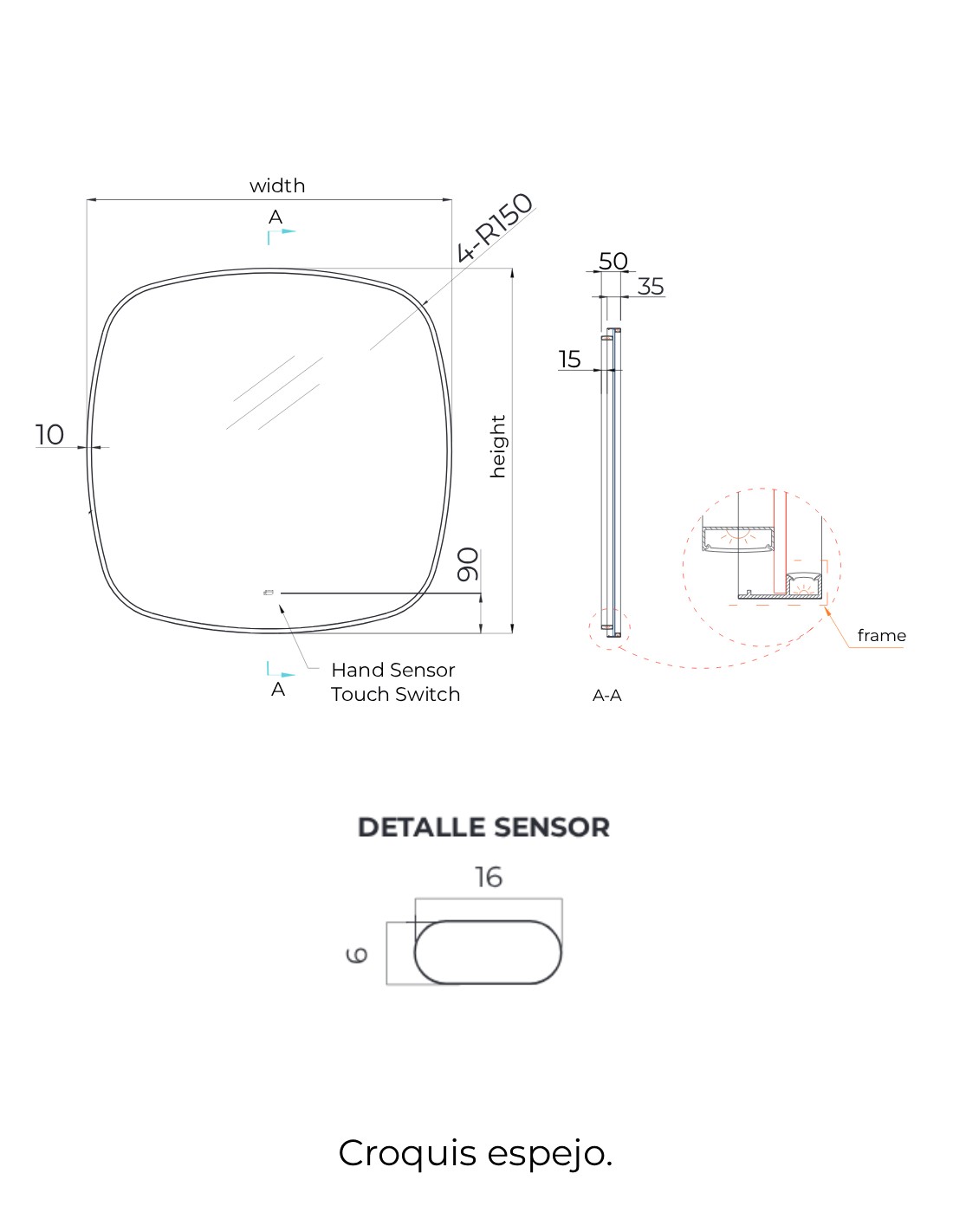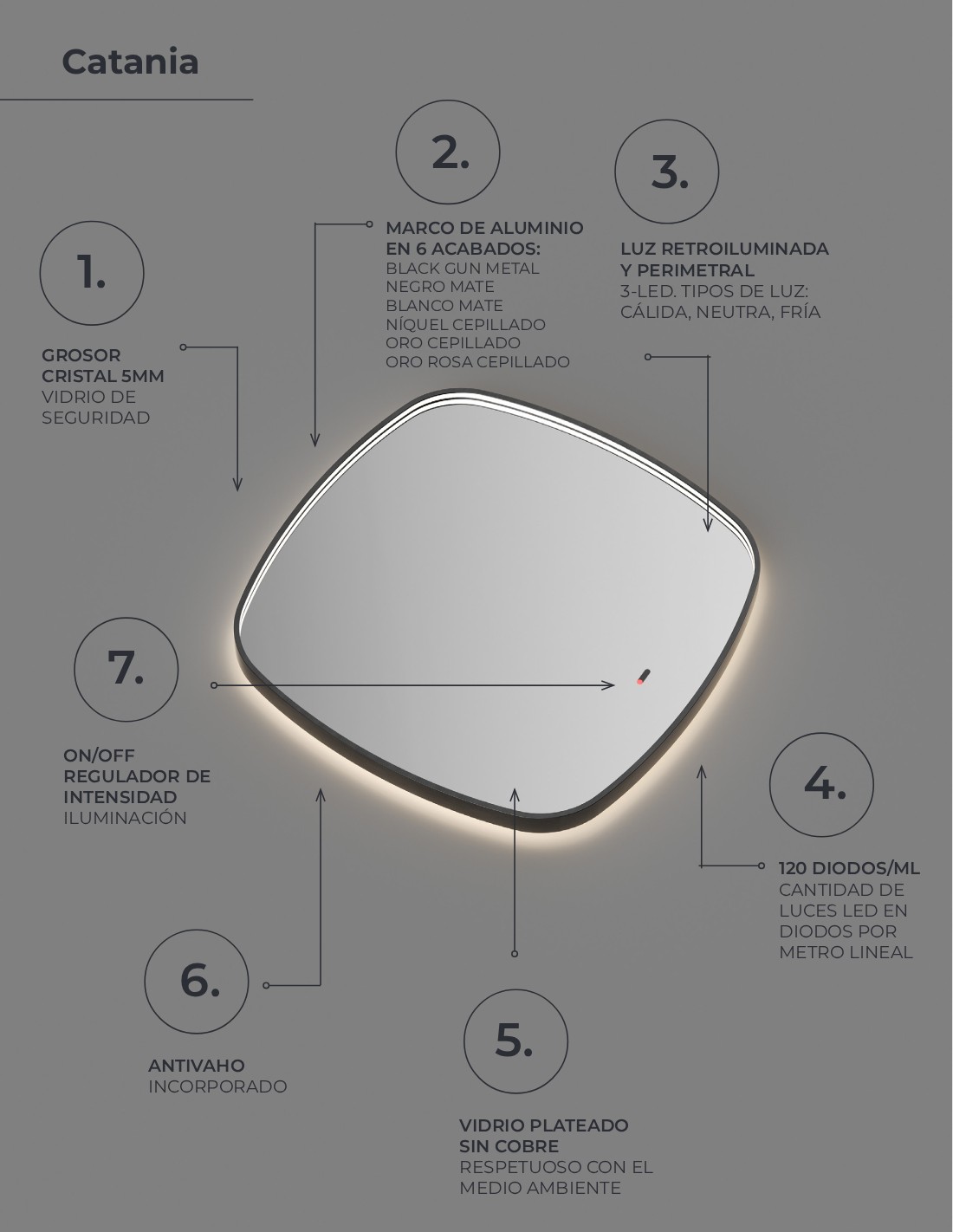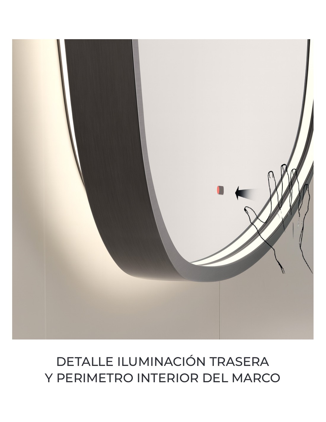 - Luz retroiluminada (por detrás del espejo) y en el perímetro interior del marco.