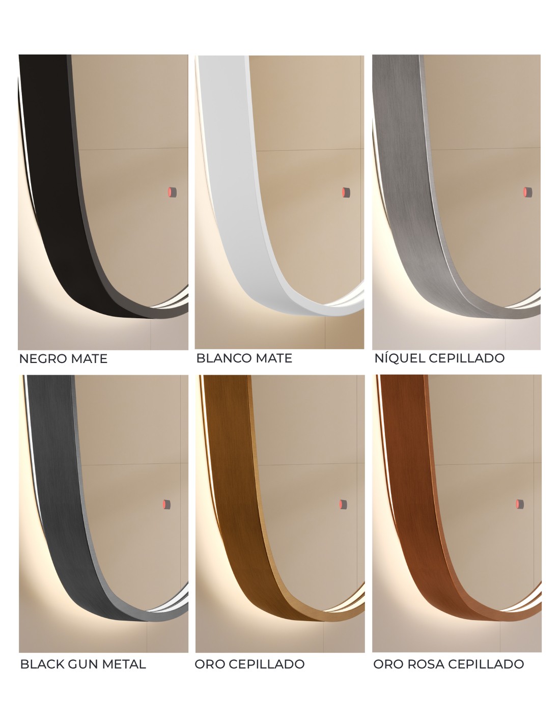 Marco de aluminio disponible en acabados: negro mate, blanco mate, black gun metal, níquel cepillado, oro cepillado y oro rosa cepillado.