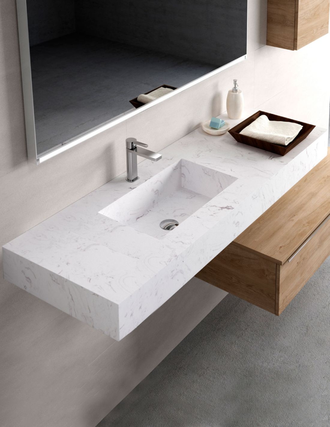 Este material ofrece la estética de la piedra natural sin su porosidad, garantizando una superficie extremadamente dura, no absorbente y fácil de mantener. Su capacidad para recrear diferentes diseños de lavabo encimera las convierte en la opción ideal para un baño de alta gama.