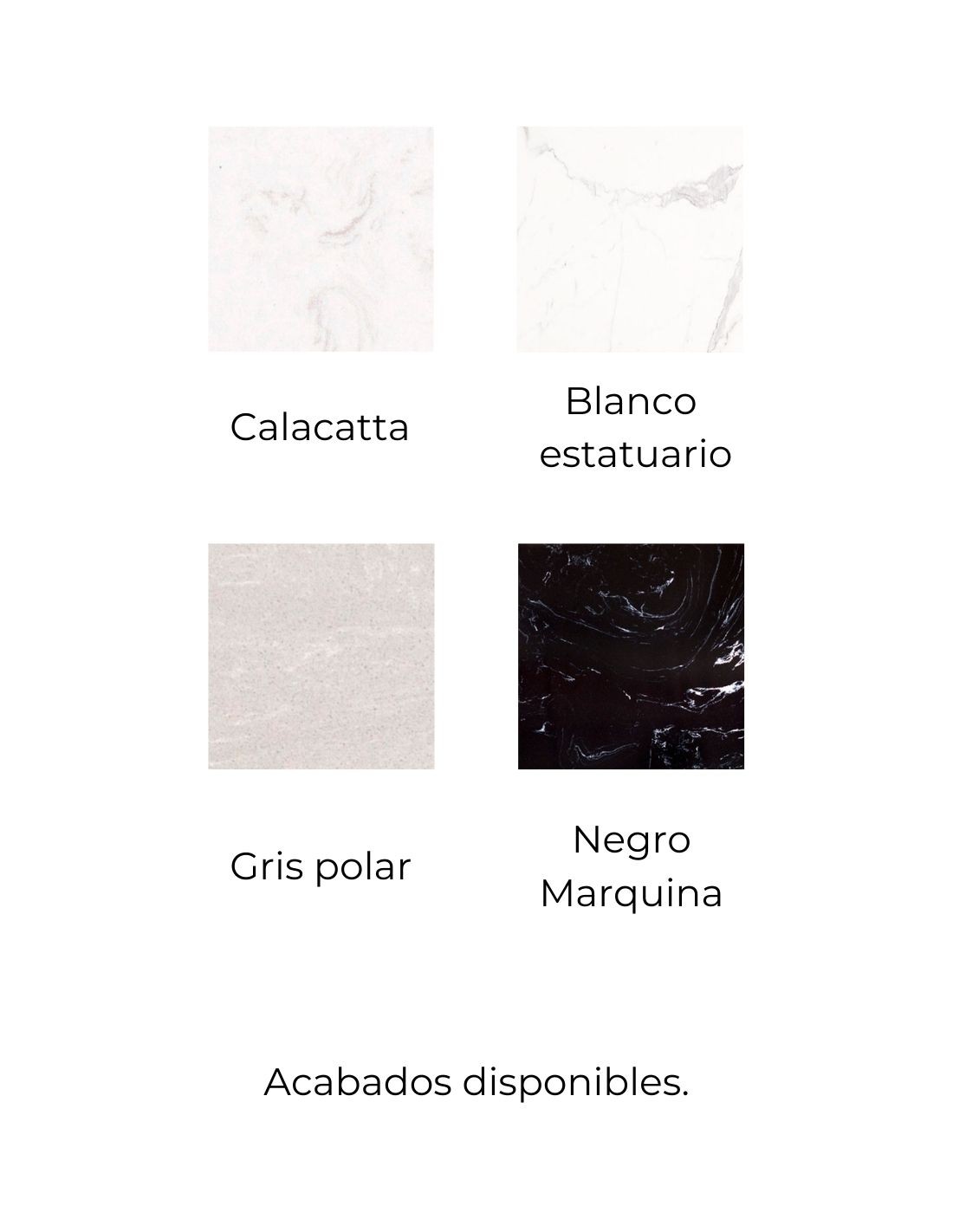 • Colores disponibles: Blanco, Calacatta o Negro Marquina.