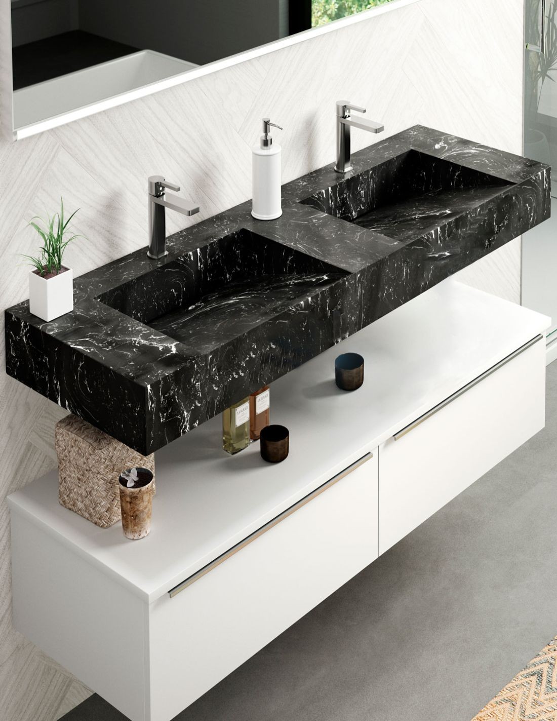 Encimera compacta doble modelo STONE PLUS de Coycama. Lavabos Stone Compact fabricada con piedra natural compacta que le aporta una durabilidad y resistencia superior al resto de materiales. Su revestimiento lo protege de cualquier agente externo y mantiene intacto la textura, el color y el tacto de la piedra.